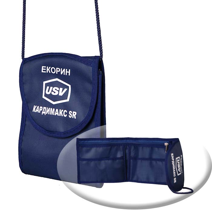 - Снаружи: состоит из основного отдела, закрывающегося клапаном на липучку. Носить можно в двух положениях – на шее и через плечо. Длина шнура регулируется.