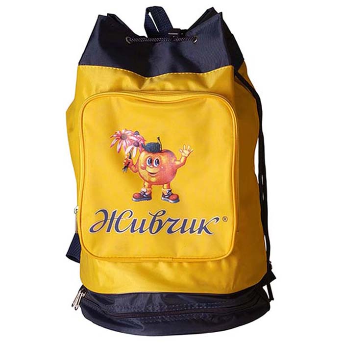 - Снаружи: основной отдел в форме мешка на люверсах, затягивается с помощью шнура, на фронтальной части объемный карман, снизу отдел с автономным входом на молнии. Петля для руки, лямки в виде ременных лент, регулируемые, ширина 40мм