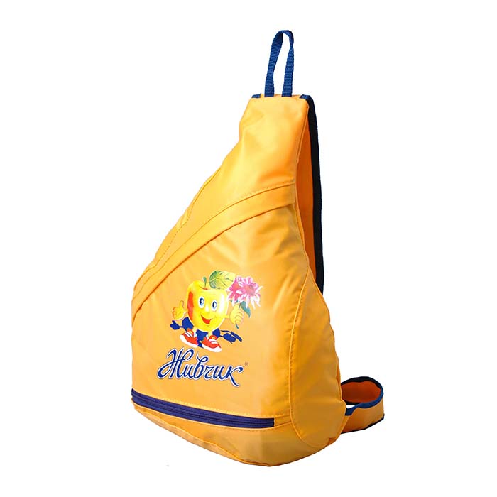 - Снаружи: один отдел треугольной формы на молнии, спрятанной под козырьком для защиты от влаги (дождь, снег) и плоский карманчик на молнии. Лямка регулируемая, пришита по диагонали, что дает возможность носить рюкзак через плечо.