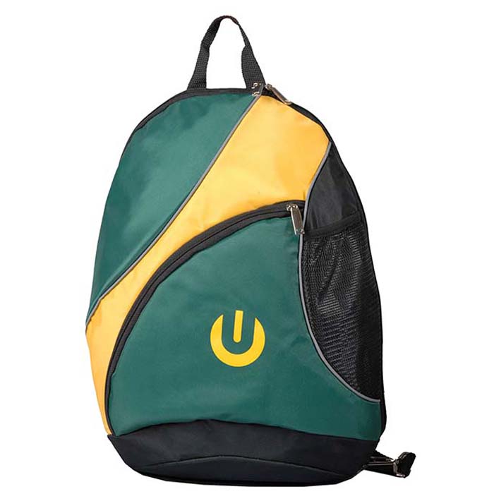 - Снаружи: один отдел, плоский карман на молнии треугольной формы, внутри которого нашит органайзер, сбоку карман из сетки. Спинка уплотнена, сверху вшита ручка. Одна широкая регулируемая лямка по диагонали, что дает возможность носить рюкзак через плечо.