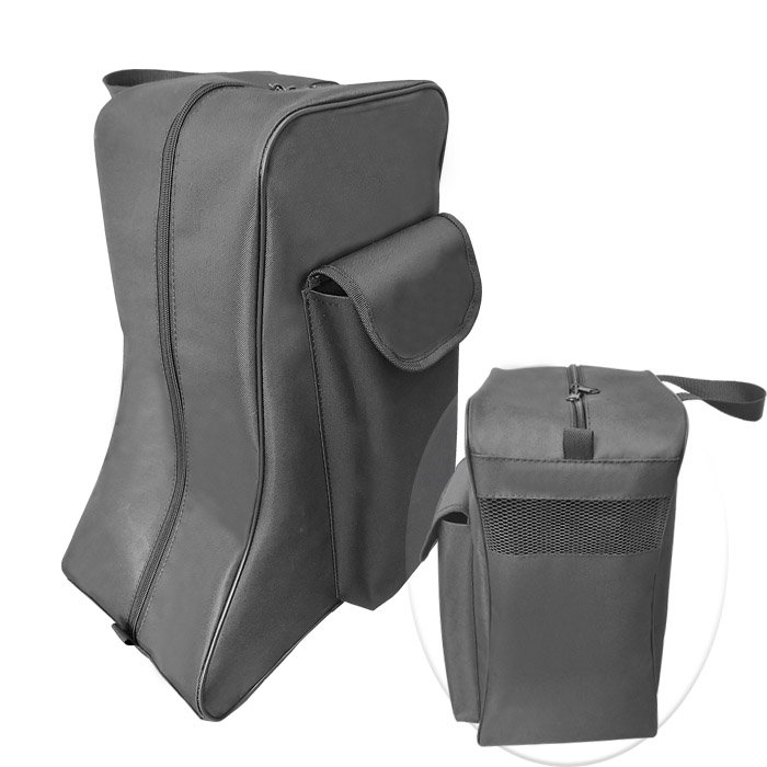 - Снаружи: Чехол на молнии, имеет форму сапог. Сбоку вшит объемный карман с клапаном на липучке для мелких аксессуаров. С тыльной стороны имеется сетка для вентиляции, сверху пришита петля для удобного переноса изделия в руке.