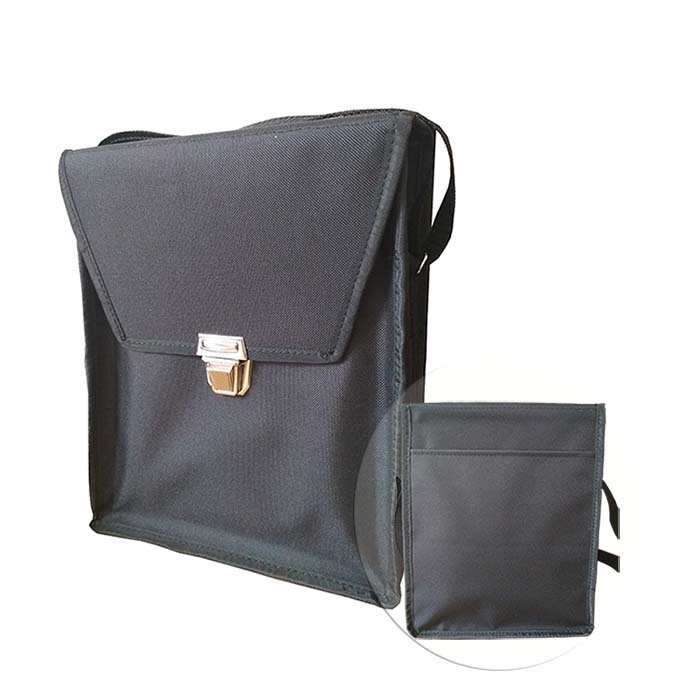 - Снаружи: основной отдел прямоугольной формы имеет жесткую форму, трехслойный: наружная ткань, картон, внутренняя ткань. Закрывается сумка на клапан с помощью замка. Плечевой ремень регулируемый.