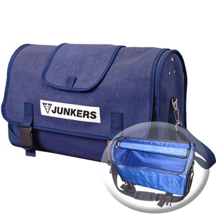- Снаружи: основной отдел имеет жесткую форму, трехслойный: наружная ткань, пластик, внутренняя ткань. Посредине имеется ручка в виде трубы, скрытая тканью, закрепленная к боковинам с помощью заклепок. Закрывается сумка на большой клапан с помощью застежек фастекс. Маленький клапан на текстильной застежке дает быстрый доступ к ручке. На дно нашиты резиновые ножки для возможности ставить изделие на загрязненную поверхность. Плечевой ремень регулируемый, с наплечником, карабины крутящиеся.