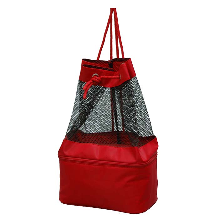 - Снаружи: сетчатый рюкзак имеет форму мешка на люверсах, затягивается с помощью толстого шнура. Шнур служит плечевыми лямками. Снизу расположено автономное отделение прямоугольной формы на молнии с термо-эффектом.