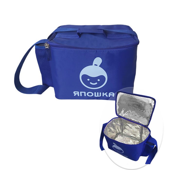 - Снаружи: сумка прямоугольной формы, застегивается на молнию. Сбоку имеется карман из сетки под литровую бутылку. Сверху вшита ручка для переноса изделия в руке и плечевой ремень. Состоит из 3-х слоев – наружная ткань – оксфорд, прослойка – фольгированная пена толщиной 5мм, внутри – фольмоткань. Объем 16 литров