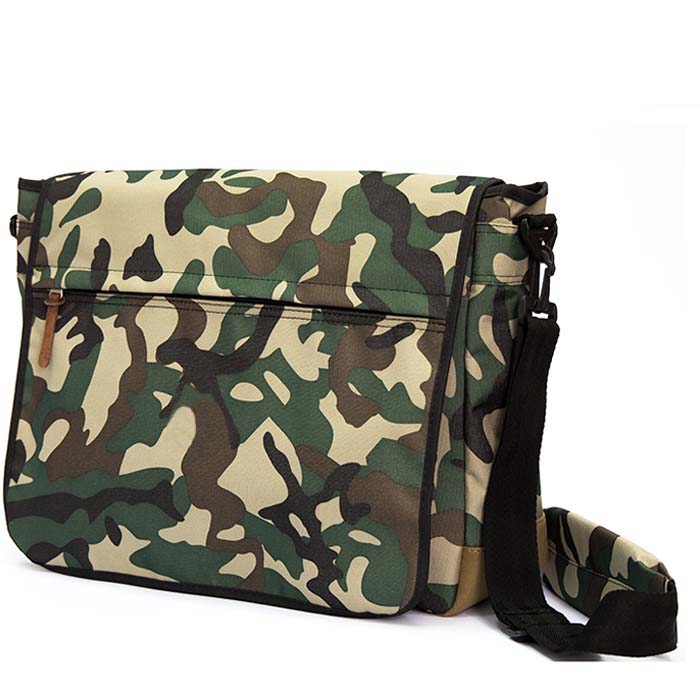 - Снаружи: основной отдел на молнии, на нем нашиты два кармана. Сумка закрывается клапаном на застежках фастекс. Плечевой ремень съемный, регулируемый. Использована пластиковая фурнитура, молния тип 8, замки «шорт» с продетым в них кожаным поводком для удобства использования.