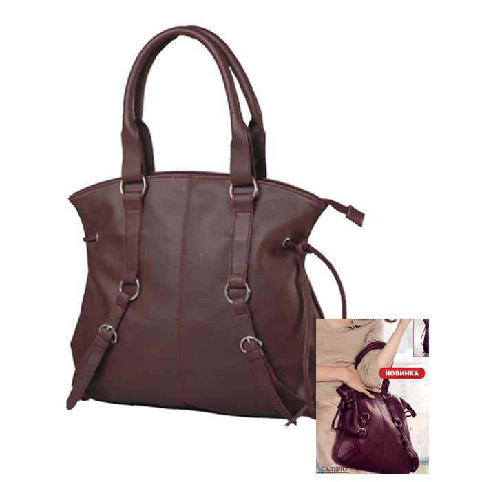 - Снаружи: основной отдел закрывается на молнию. Длина ручек позволяет носить сумку в руке, через плечо, на предплечье, при согнутой в локте руке. На фронтальной стороне нашита декоративная отделка из ремешков с пряжками.