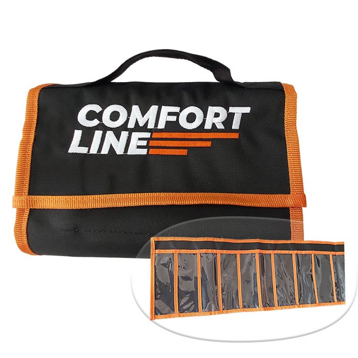 - Зовні: чохол виконаний у вигляді стрічки з нашитими з прозорої ПВХ плівки кишенями. Складається в компактну сумочку. Фіксується за допомогою текстильної застібки. Має зверху ручку для зручного перенесення в руці.